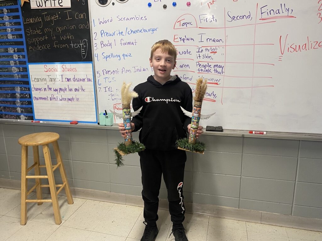 The fifth graders at Lynn Camp Elementary School in Knox County, Kentucky, had the chance to showcase their knowledge of geography and the cultures of two American Indian regions. The students had learned about seven American Indian regions. They worked with a partner or individually to write three paragraphs comparing and contrasting two of the regions. They then got to create a visual for their projects. The visuals ranged from slideshow presentations, totem poles, teepees, wigwams, and drawings.