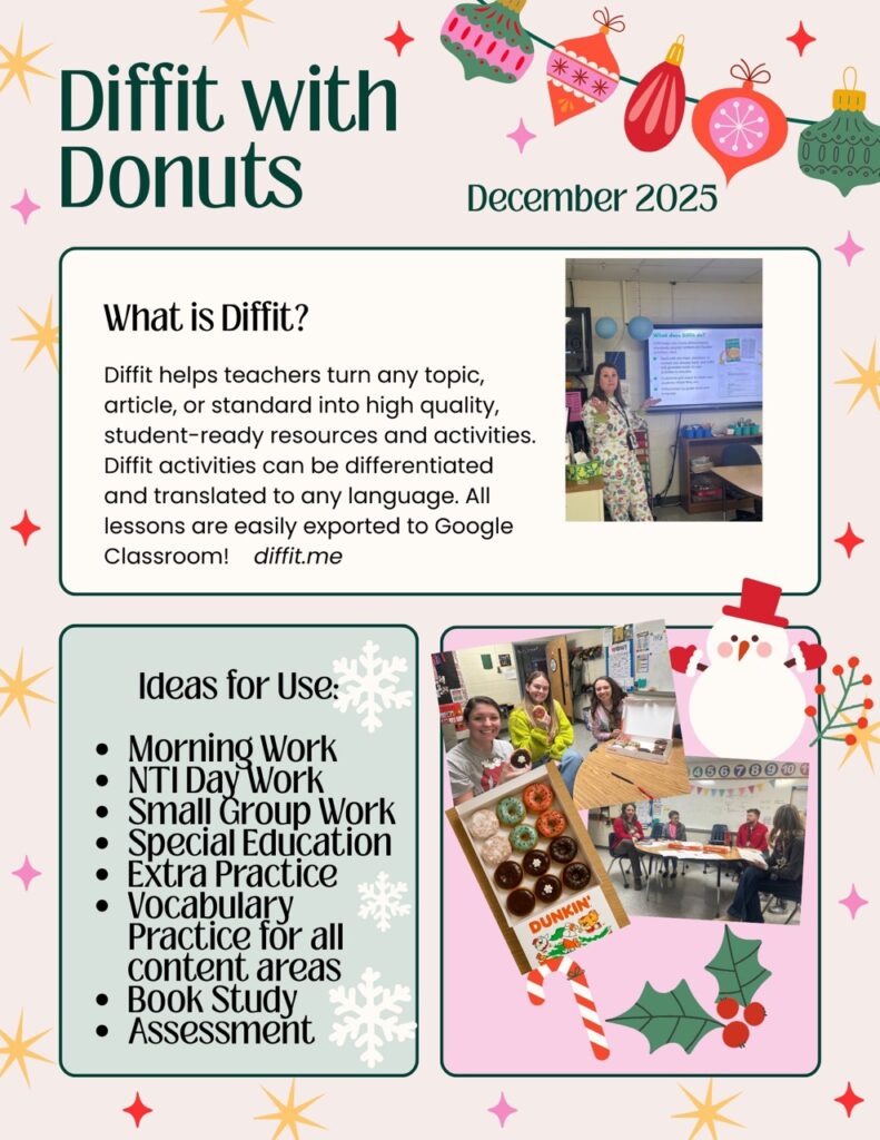I had the opportunity to present Diffit with Donuts to some of my colleagues. I love using Diffit for creating fast, high quality, student-ready resources and activities. My colleagues were blown away by the amazing resources that Diffit provides!!! Our special education staff brainstormed ways to use Diffit to differentiate reading and vocabulary assignments. We discussed how to use Diffit for our NIT days due to the ease of exporting assignments to Google Classroom!