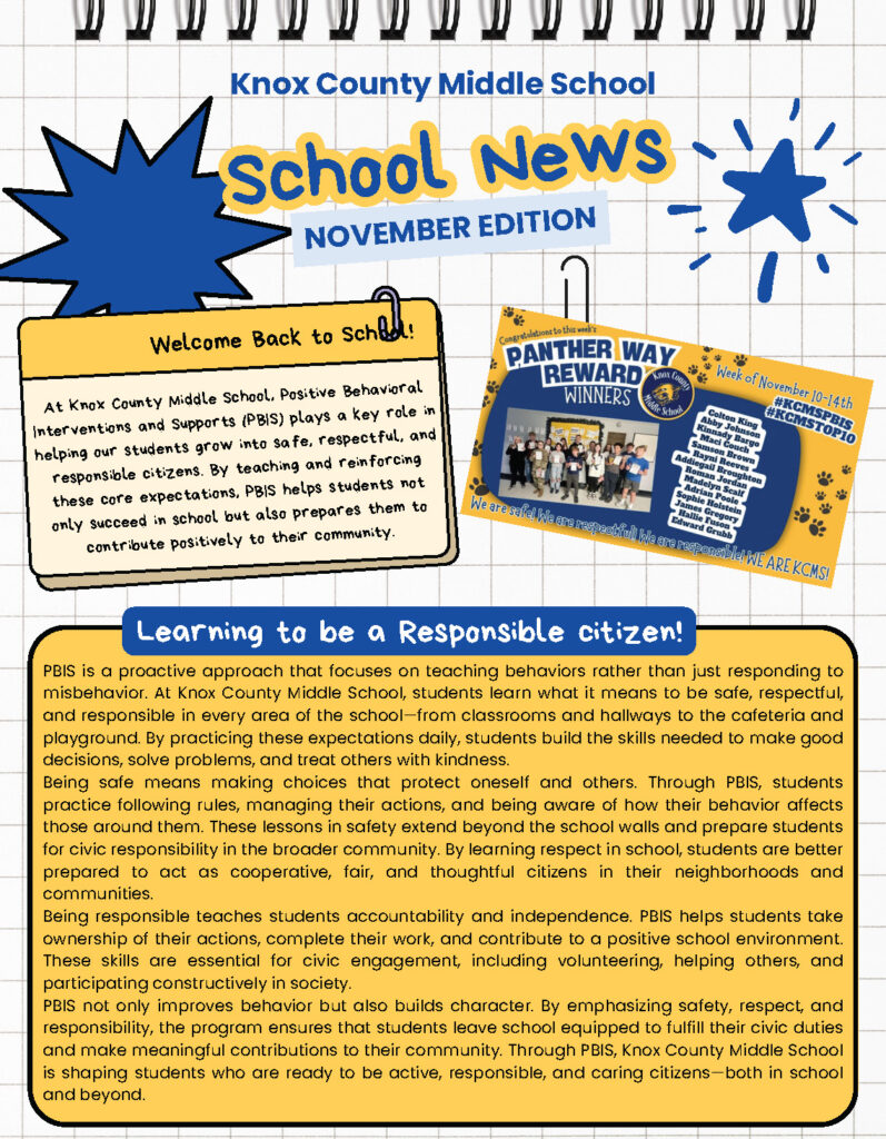 At Knox County Middle School, Positive Behavioral Interventions and Supports (PBIS) plays a key role in helping our students grow into safe, respectful, and responsible citizens. By teaching and reinforcing these core expectations, PBIS helps students not only succeed in school but also prepares them to contribute positively to their community.
