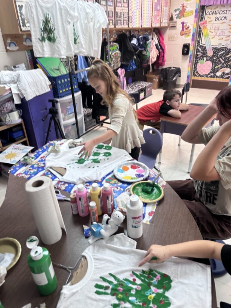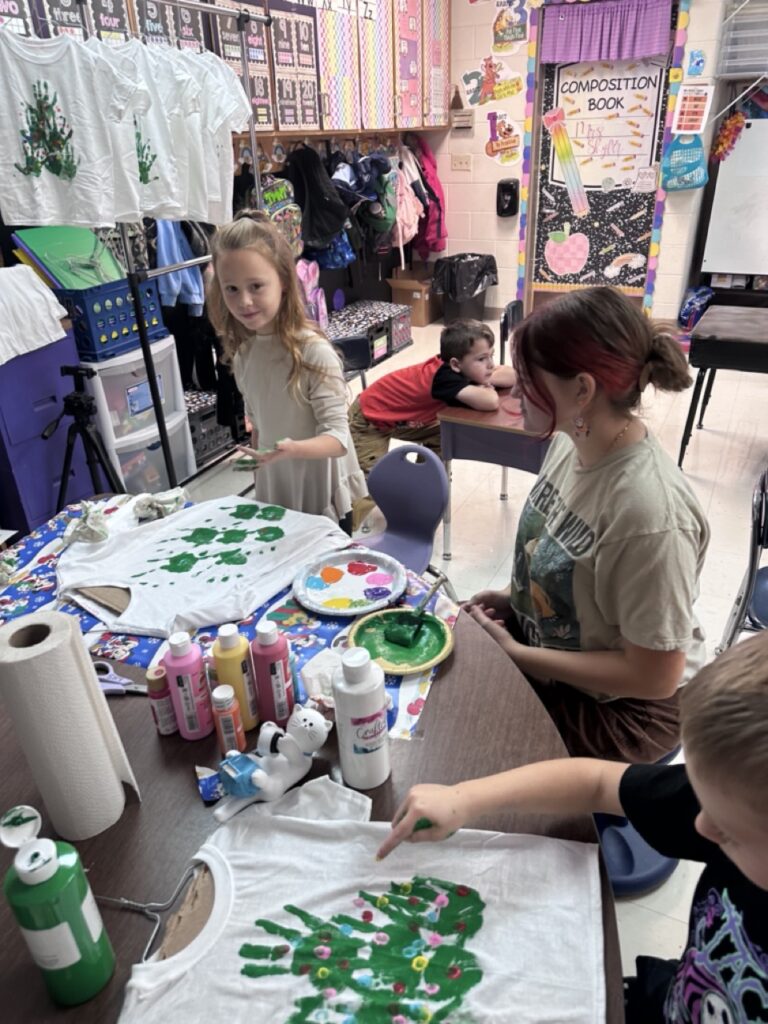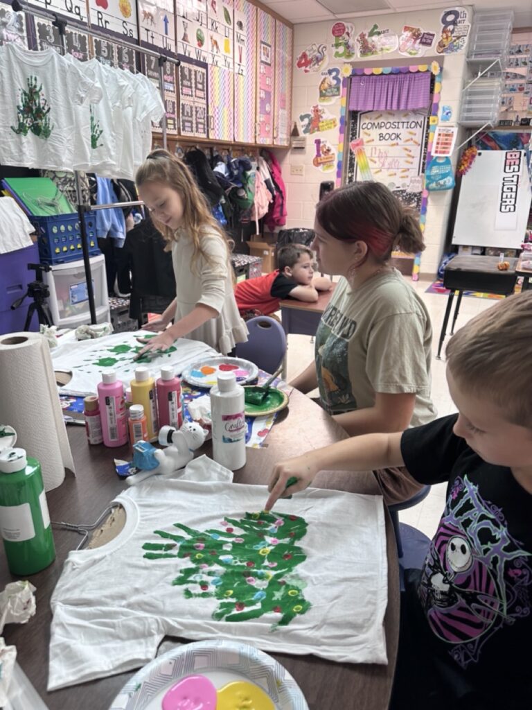 In our festive “Santa’s Workshop” art activities, my first graders worked like joyful little elves—cutting, creating, and imagining as they brought holiday scenes to life. Their artwork became more than decorations; it connected beautifully to social studies as they explored community roles, traditions, and how people work together during special celebrations. A high school volunteer helped guide the students, encouraging their creativity and showing them what helpful community leadership looks like. Together, they turned our classroom into a place where learning, teamwork, and holiday cheer all came together.