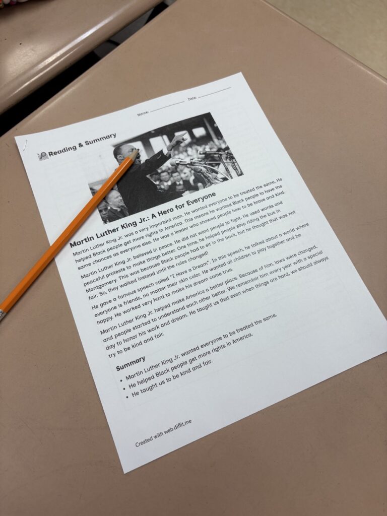 - Social Studies: Students explored the historical context of the 1950s and 60s, learning about the challenges Dr. King faced and his role in the American Civil Rights Movement.